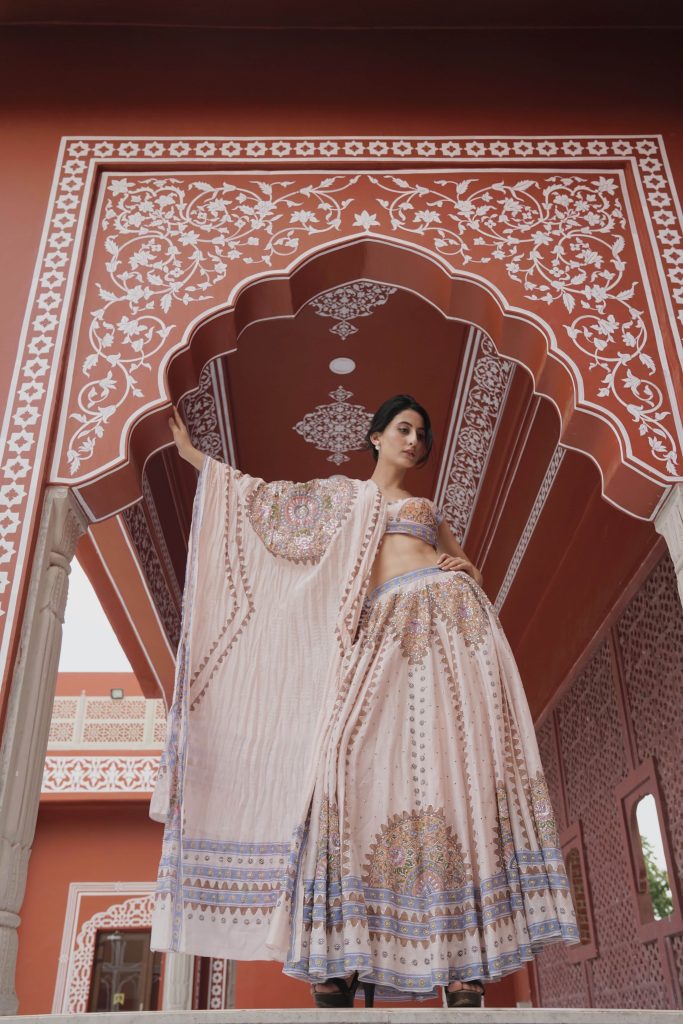 ₹32,000.00Colour: Peach Pink Fabric: Chanderi Block Print: Block print