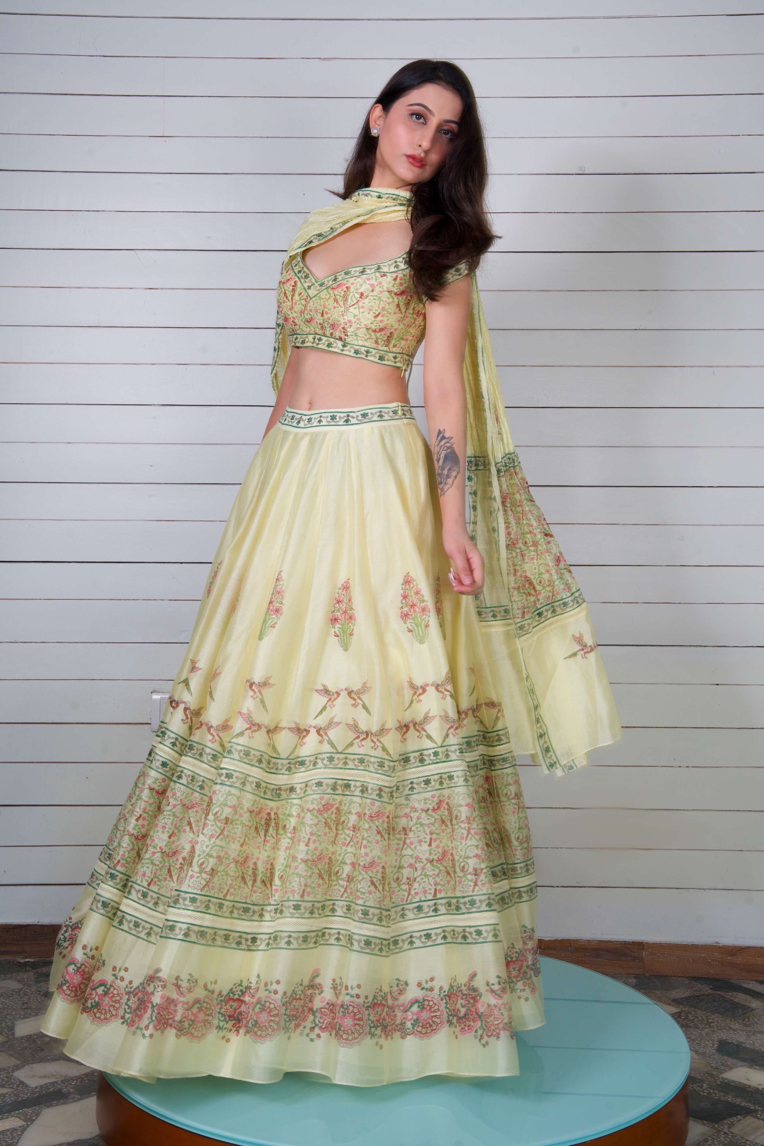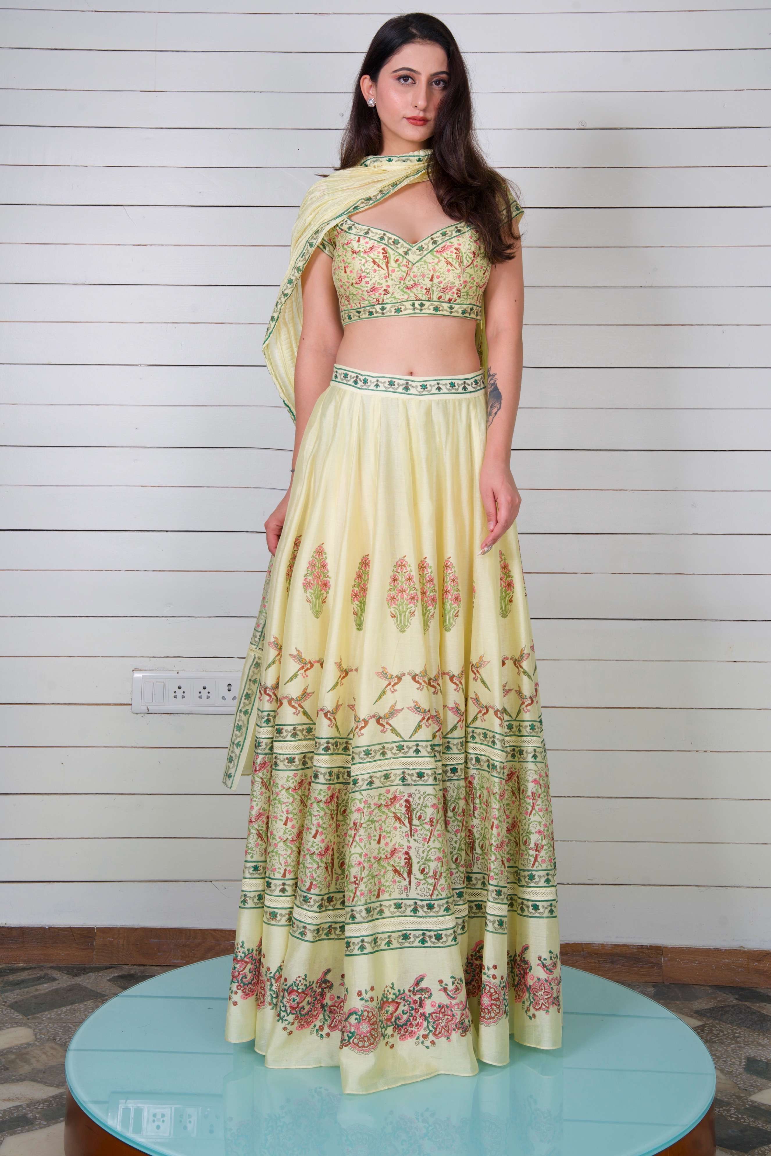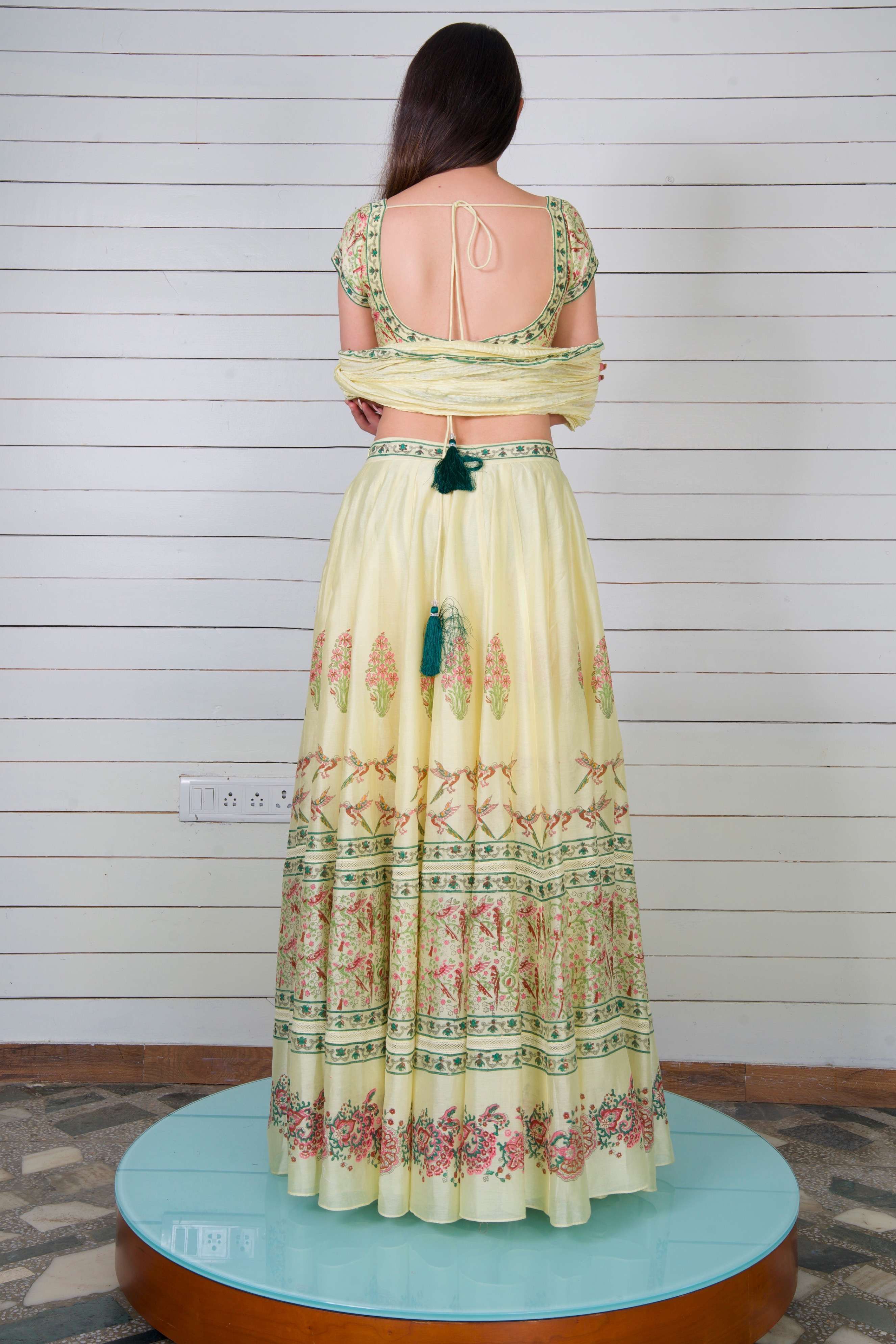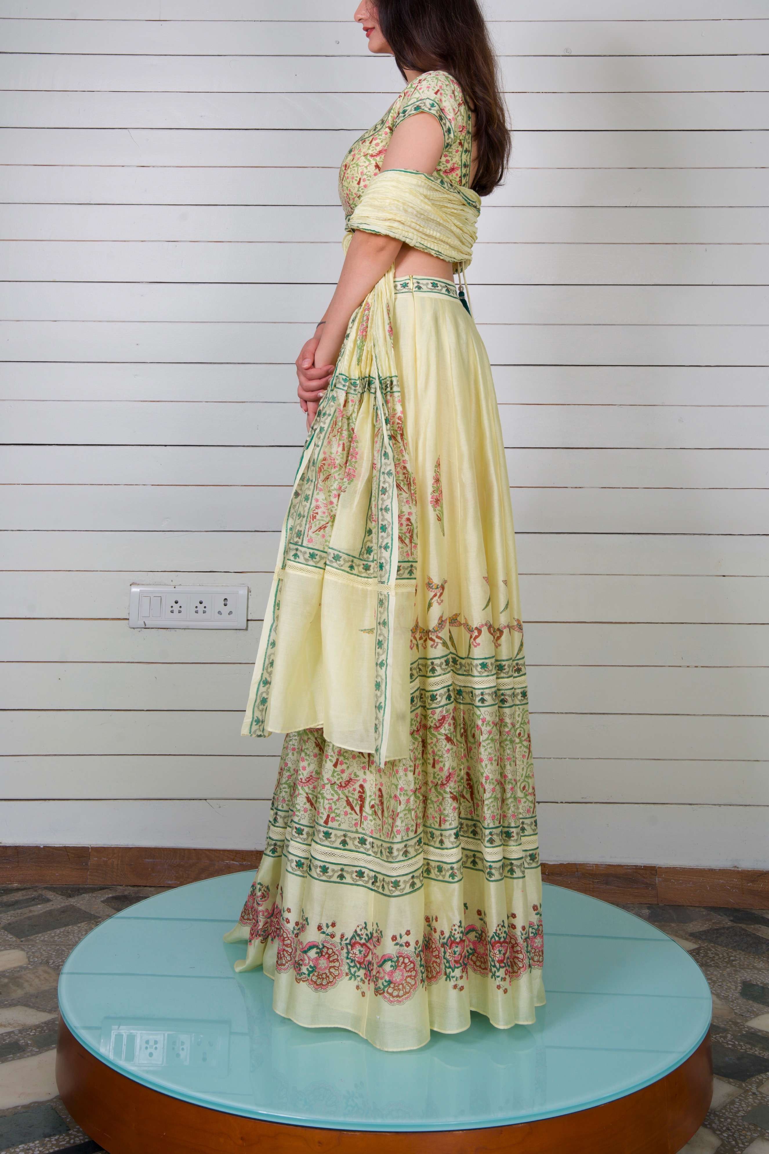 The Pajarito Lehenga Set captures the essence of spring with its vibrant bird and floral hand block prints set against soft yellow silk Chanderi, making every twirl a celebration of nature’s beauty.