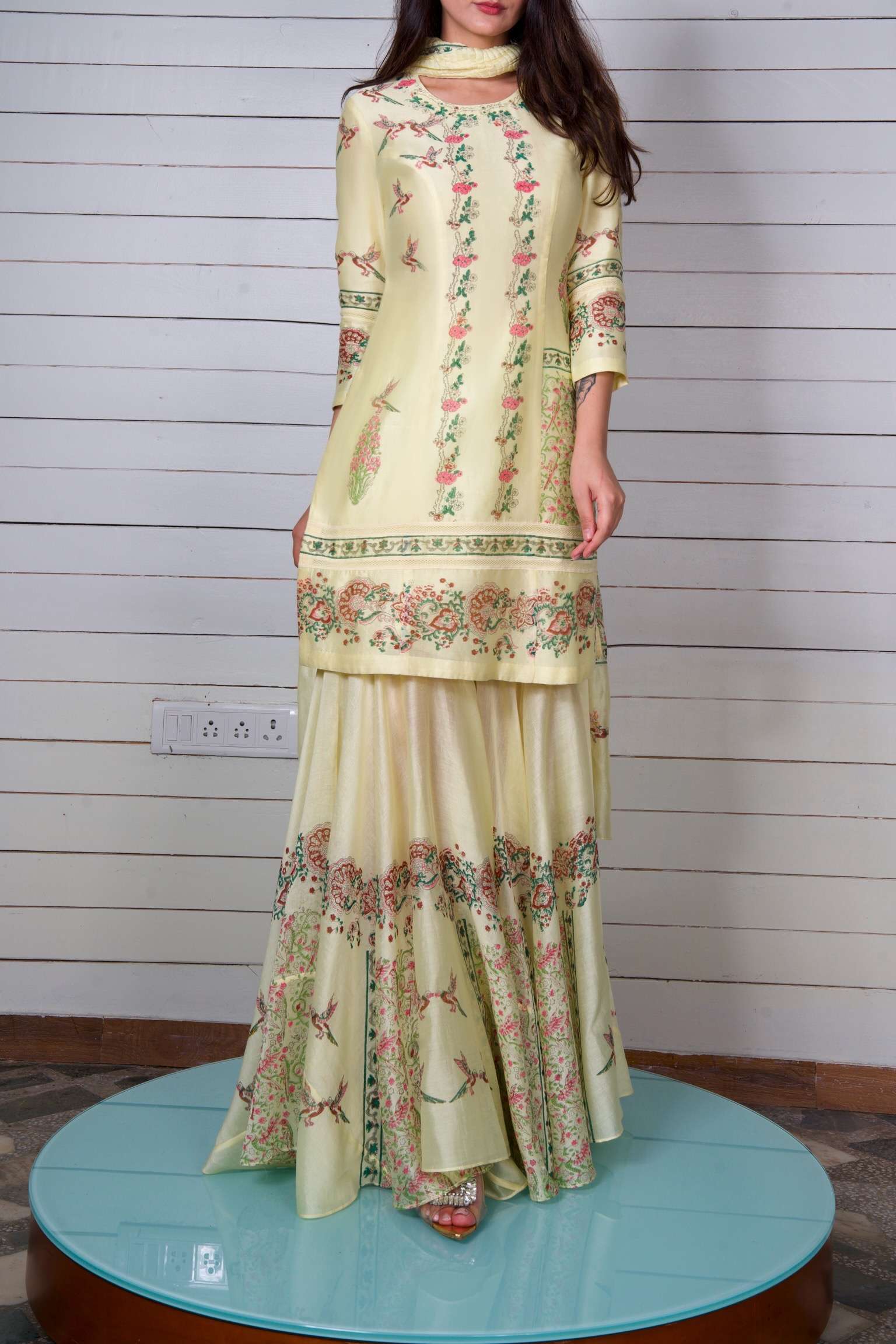Cotton Chanderi New Flaming-Flora-Three Pc Garara Set Legacy of Elegance: The Garara Reimagined Stepping back in time, drawing from the opulent Mughal era, we present our exquisite Garara set from the “Flaming Flora” collection. Marrying the fierce sword of flames motif, intricately embroidered in radiant red, with the timeless beauty of floral hand block prints....