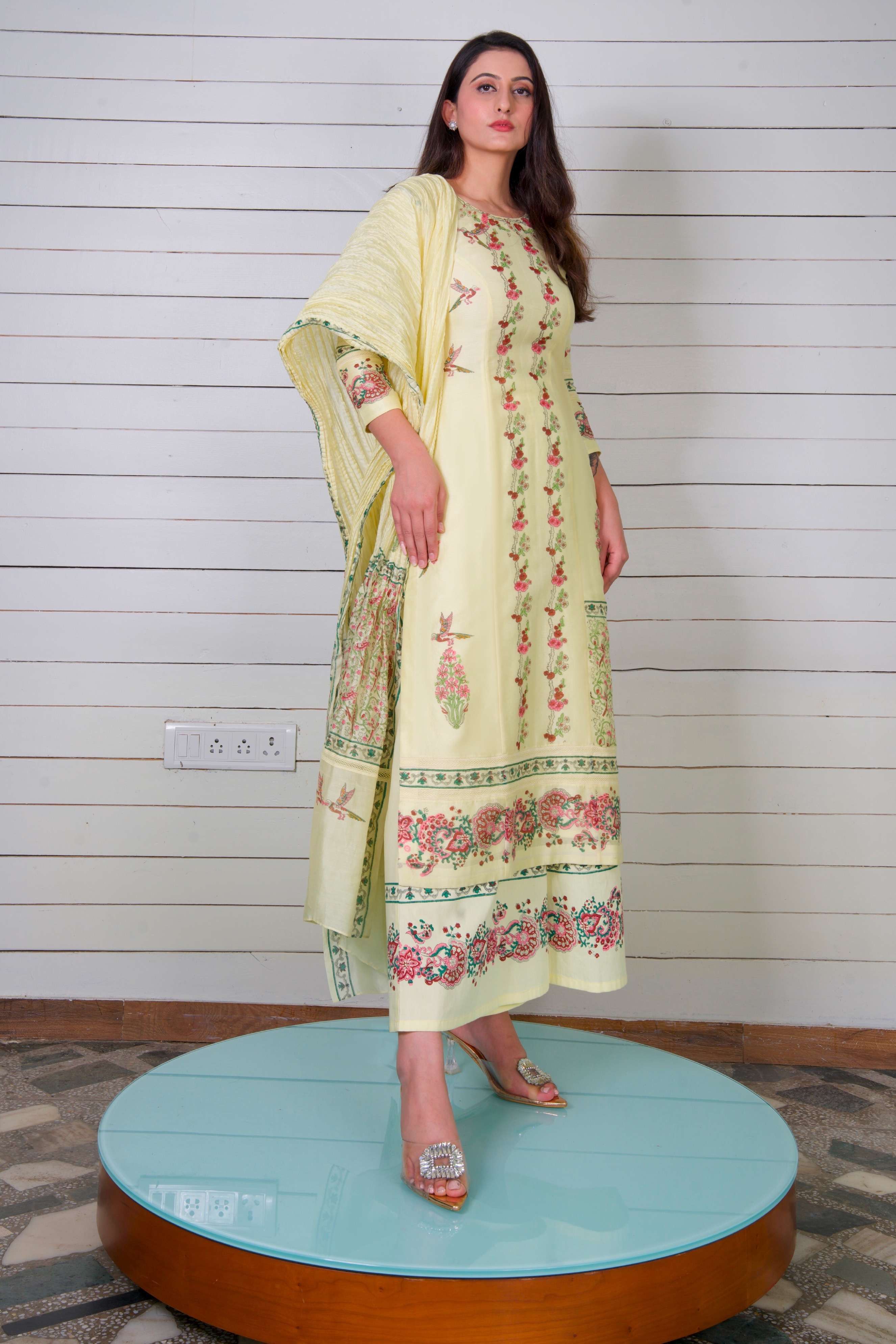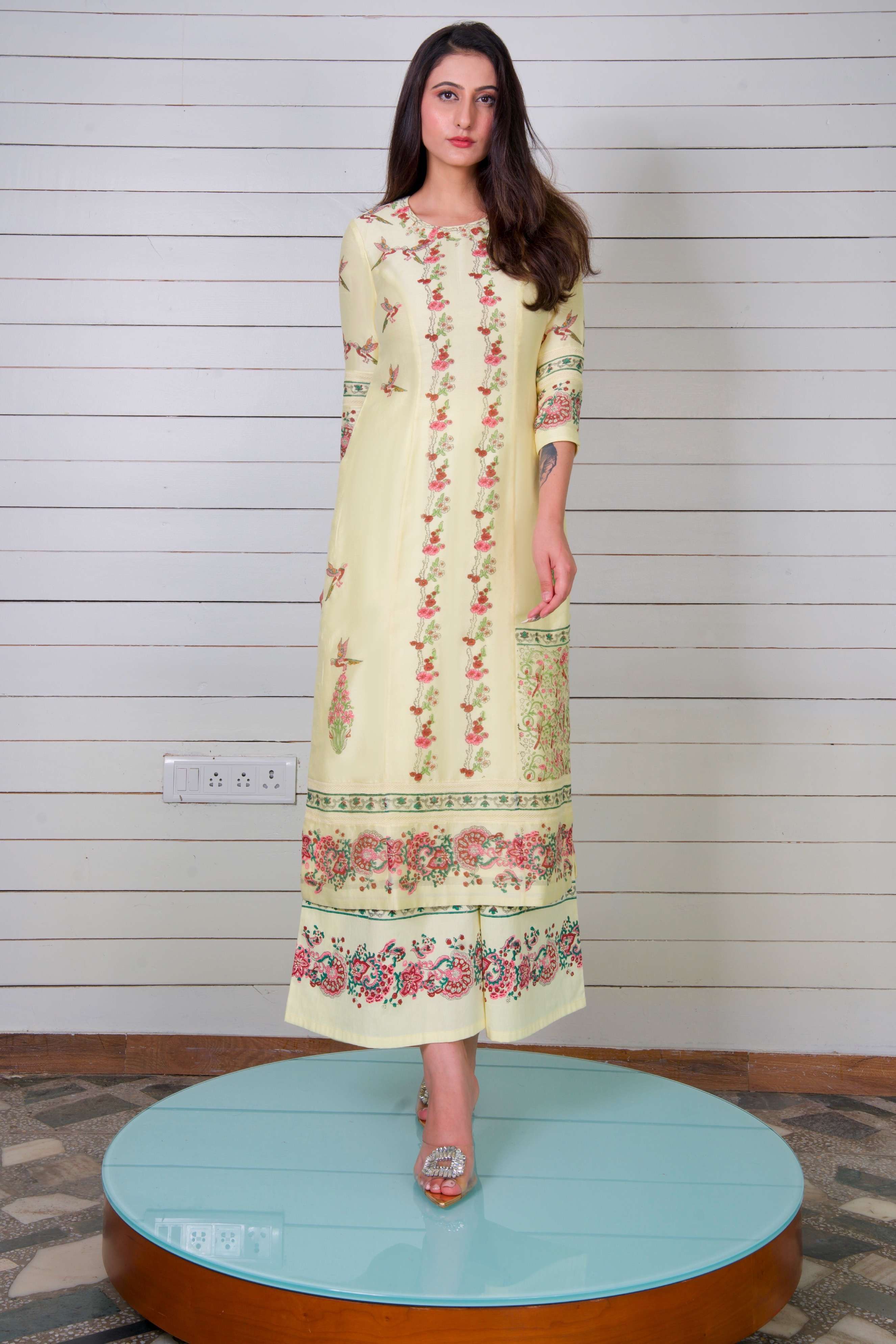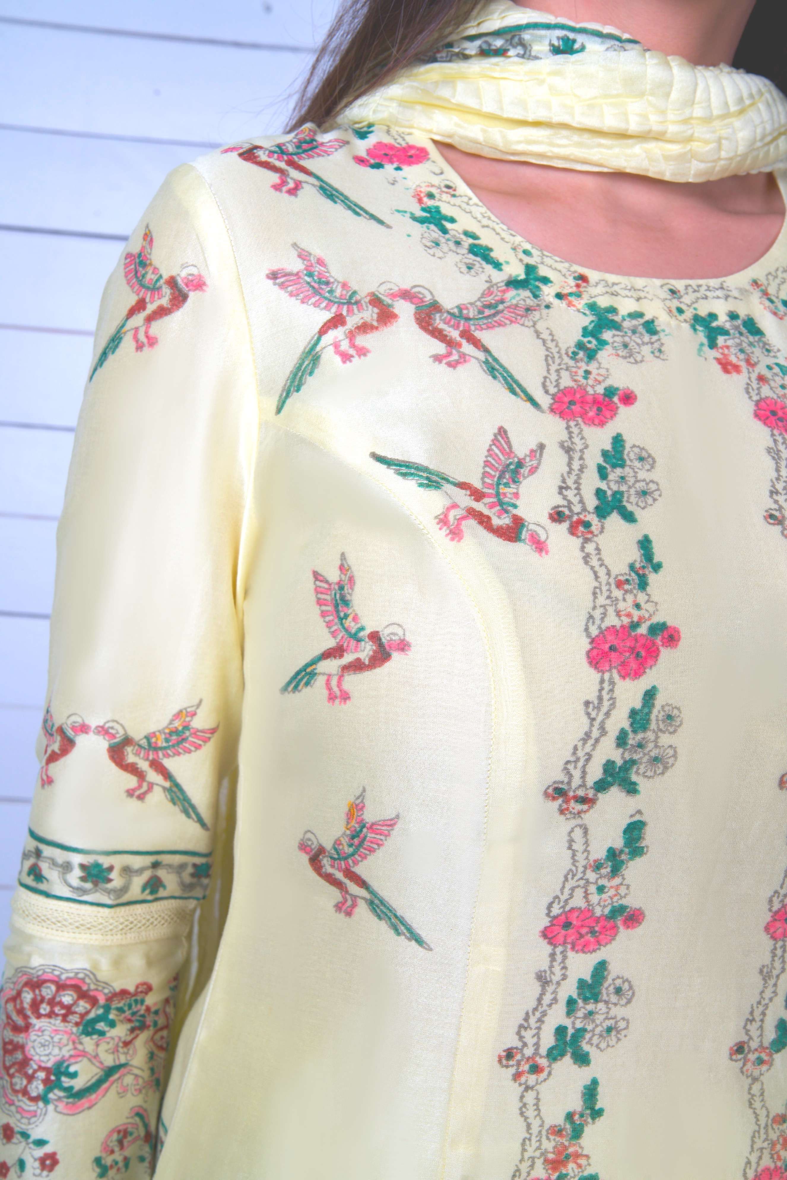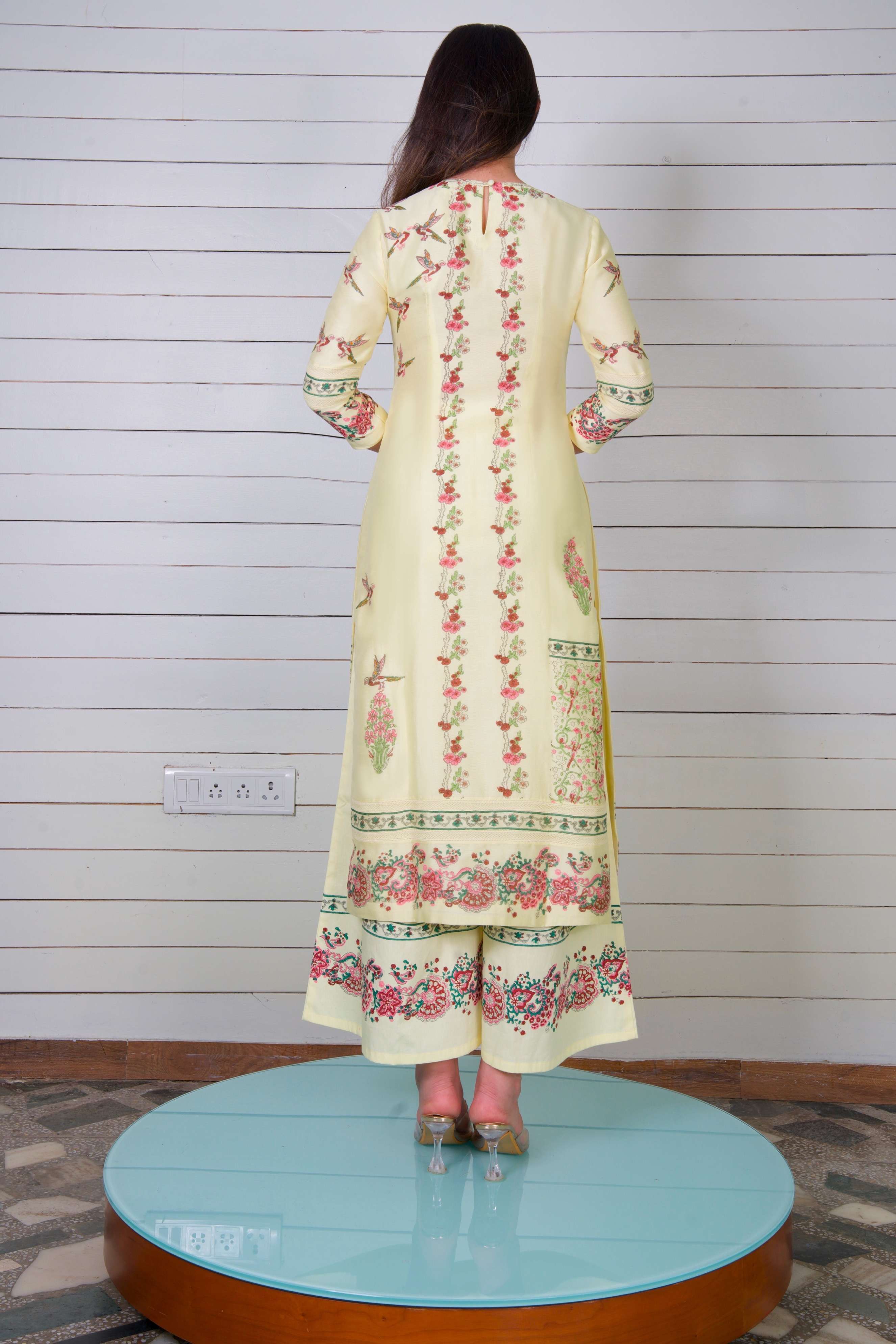 Pajarito Culotte Set: Step into comfort and style with the Pajarito Culotte Set, where airy silk Chanderi adorned with bird and bloom motifs combines with wide-leg culottes for a look that’s both relaxed and refined.