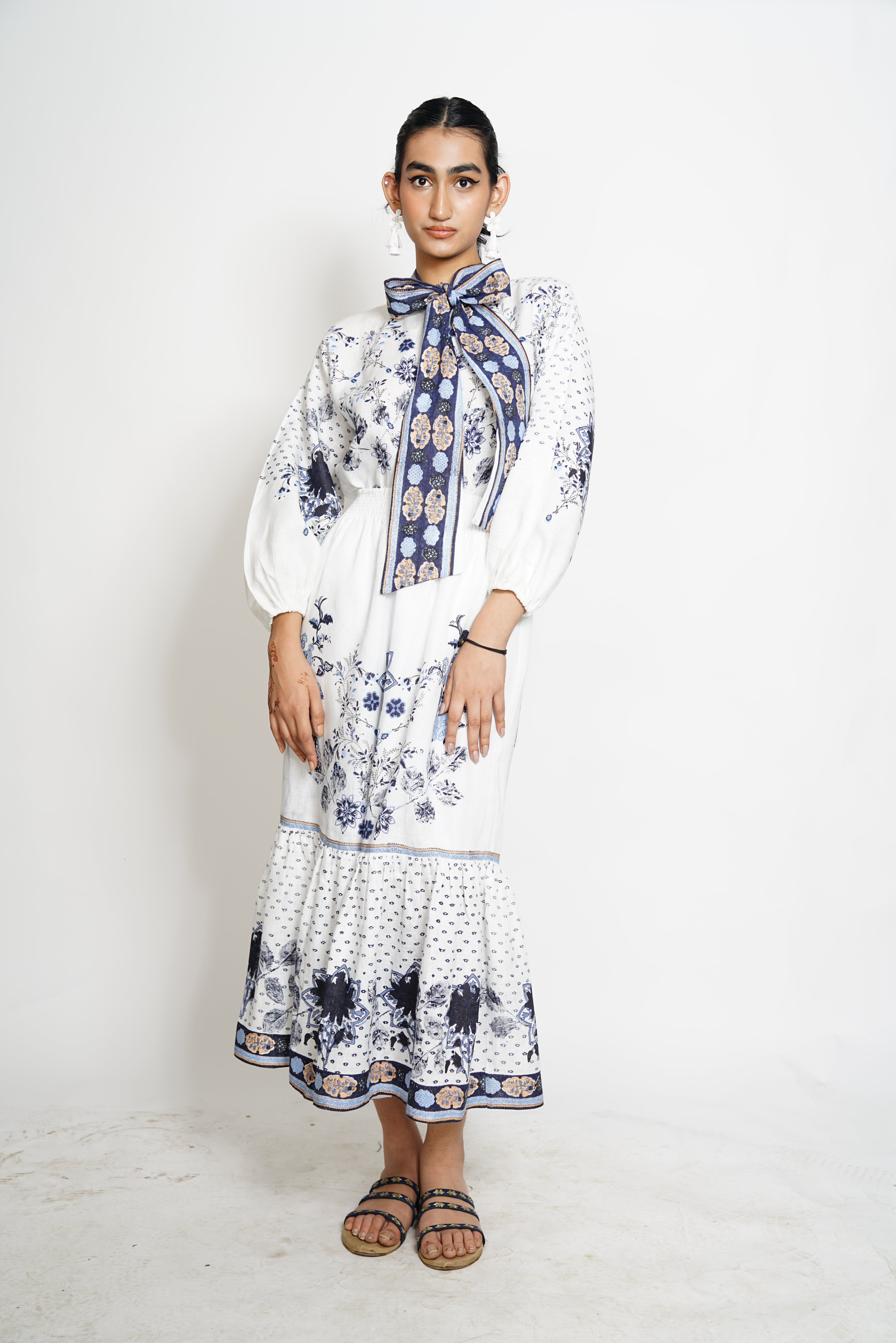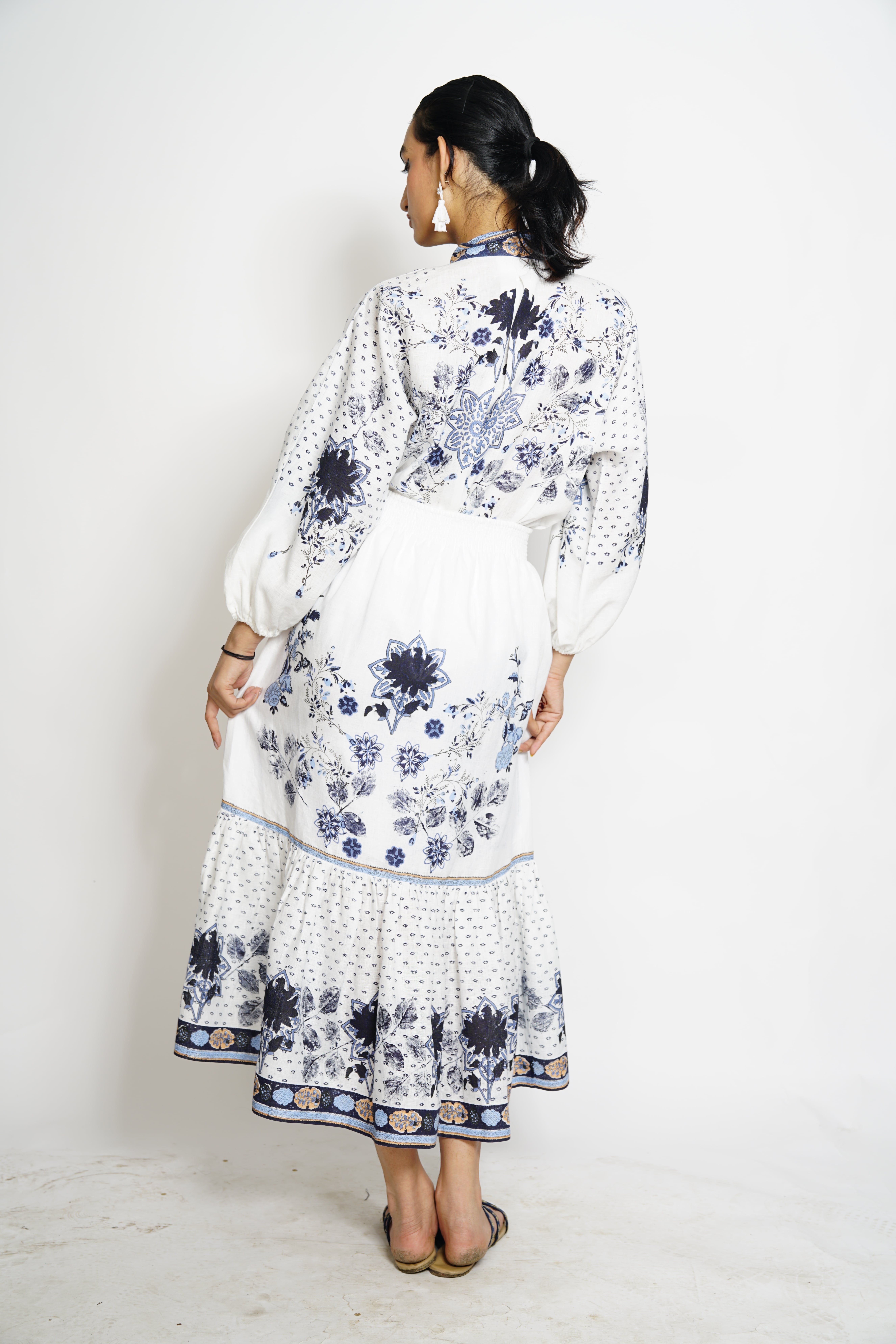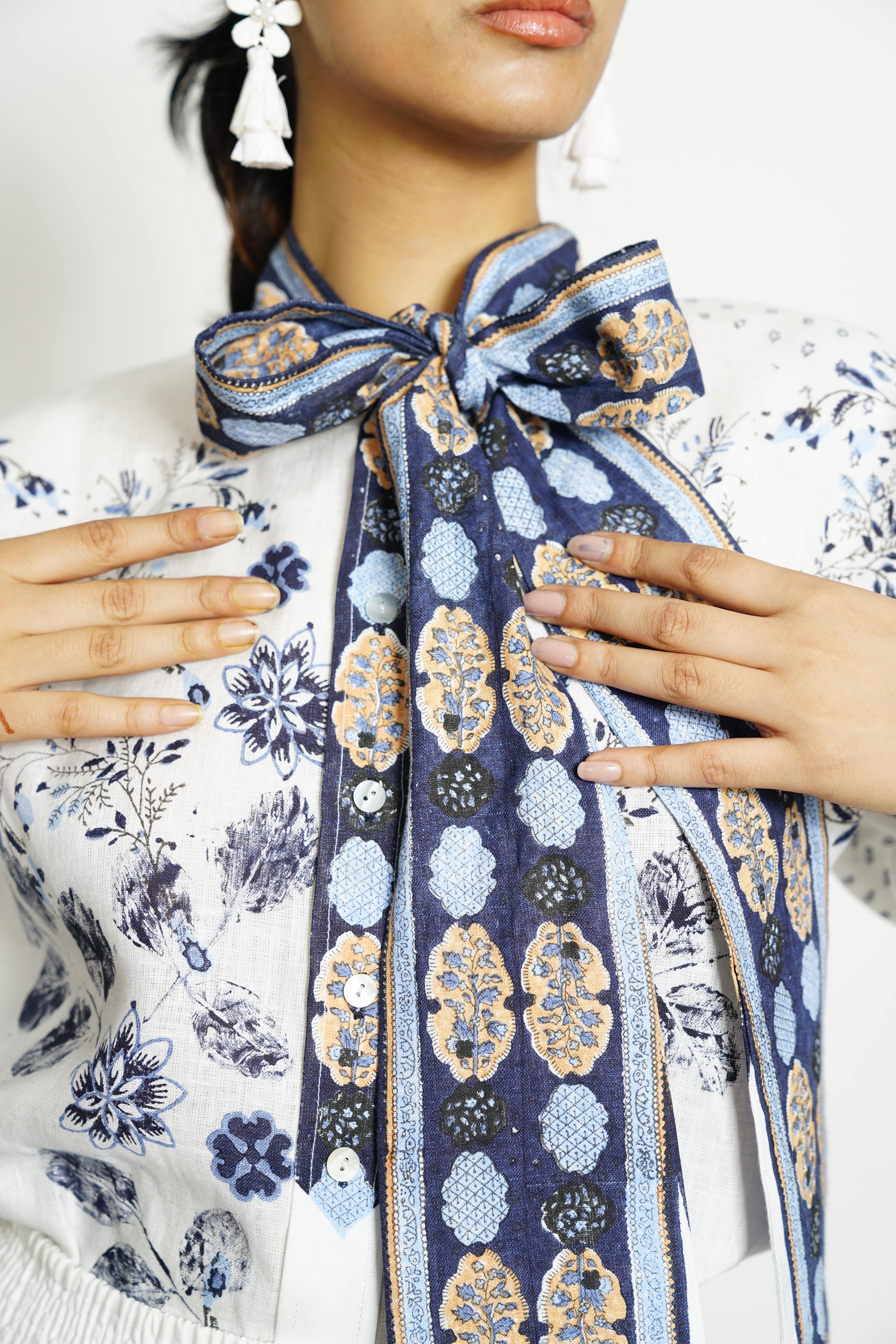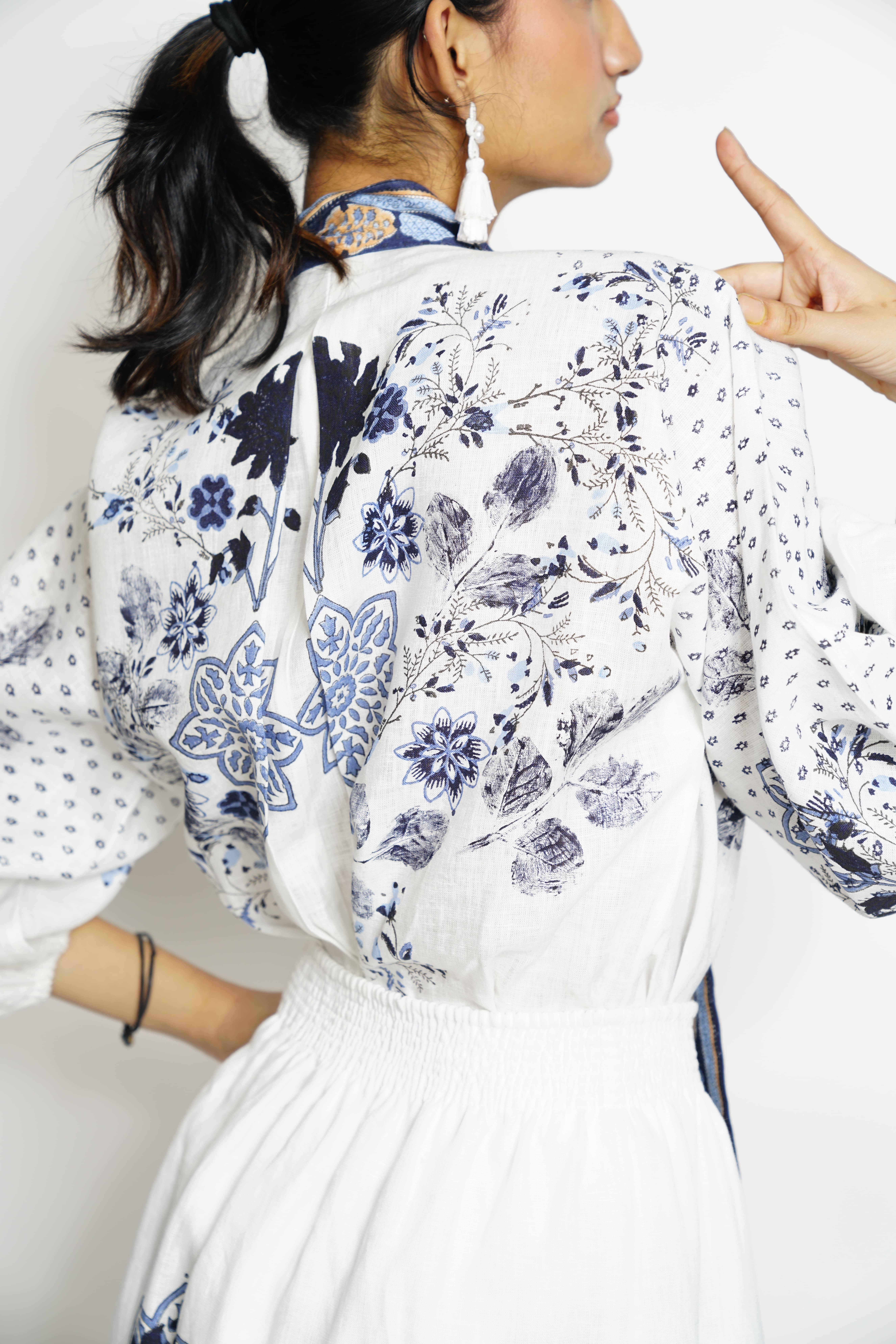 A fusion of indigo dreams and white whispers, crafted with delicate hand block prints and serene leaf impressions. Perfect for breezy summer days in soft linens and cottons. Colour: White/Blue Fabric: Linen Print: Block print