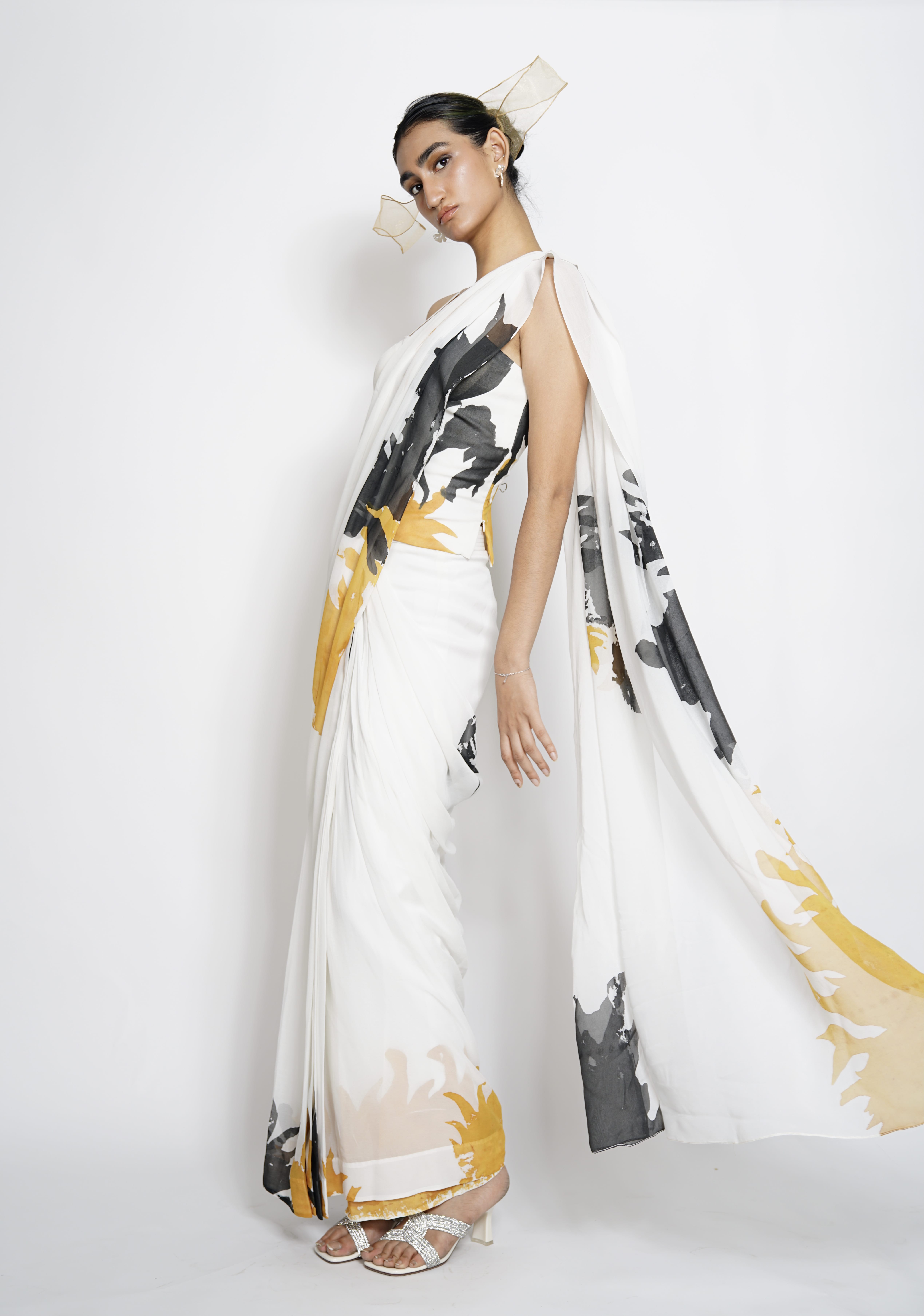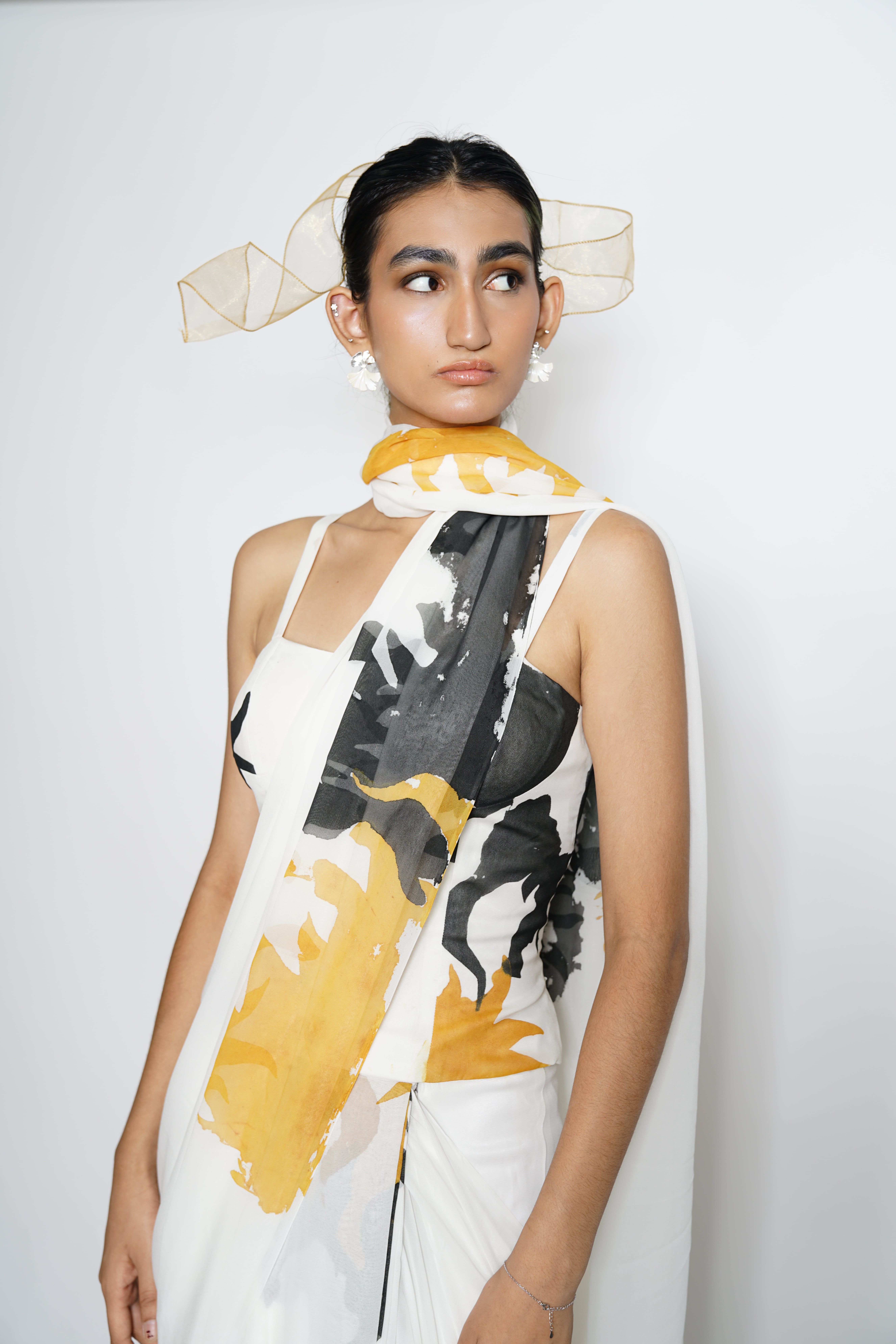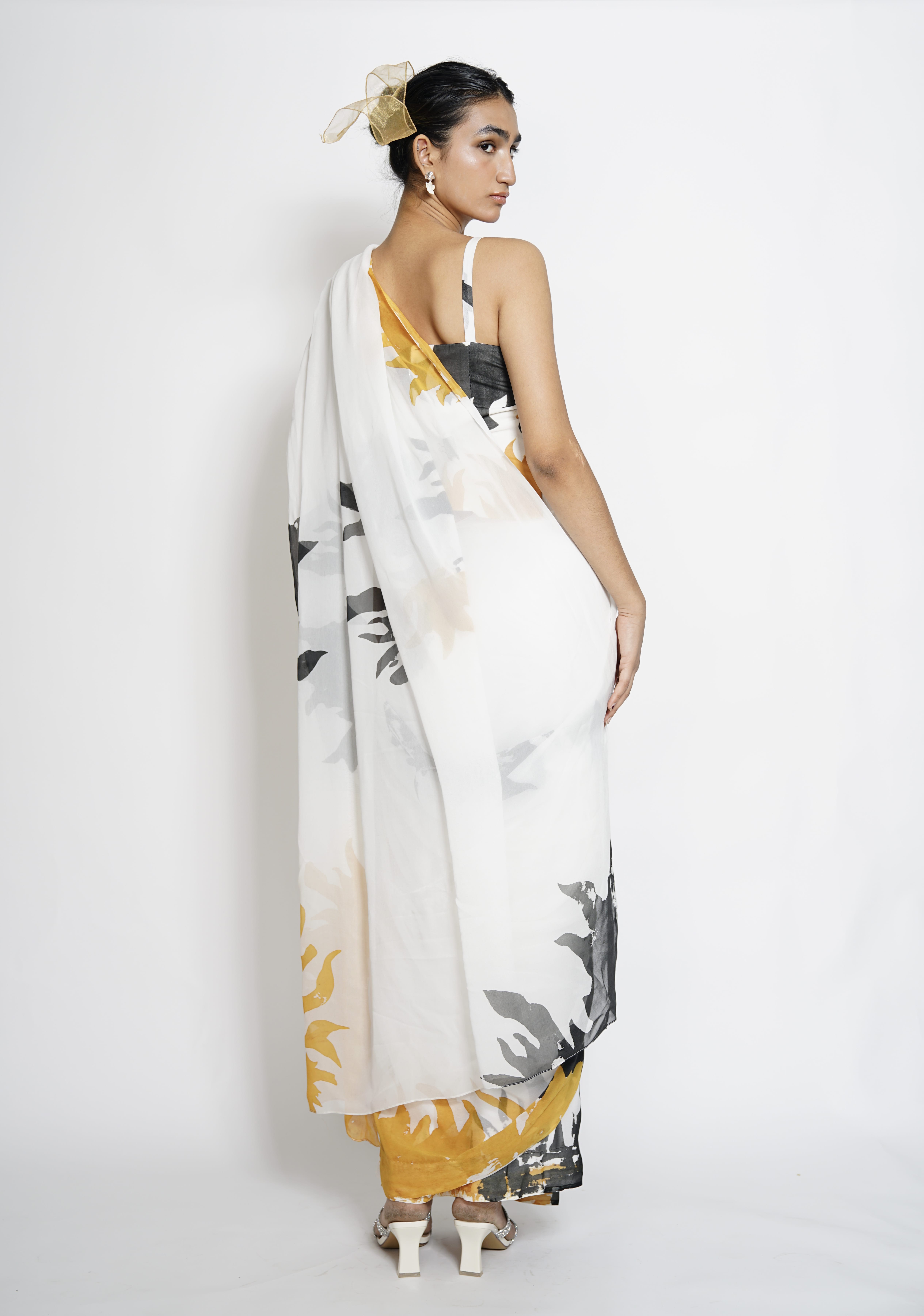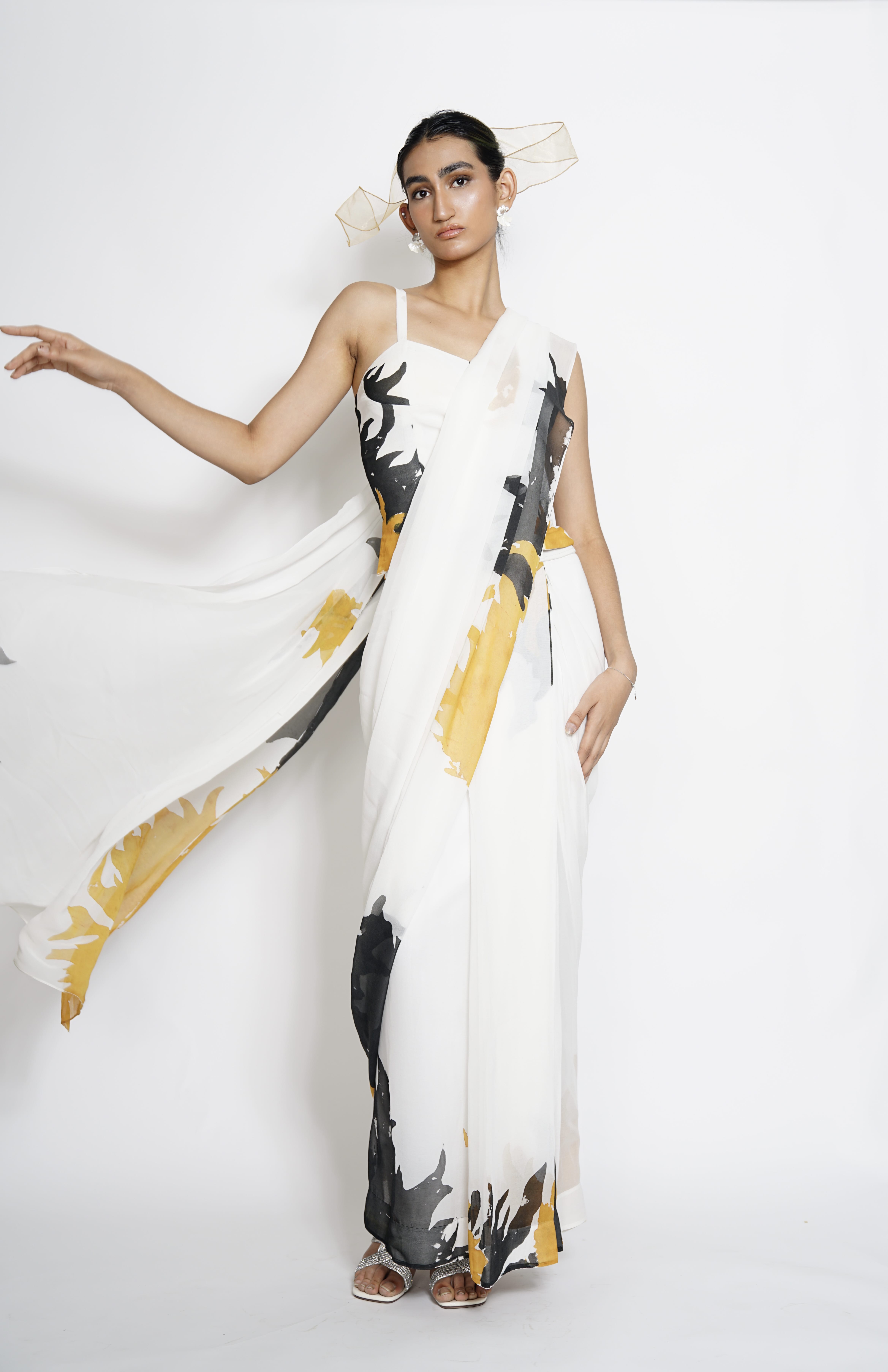 Elevate your everyday elegance with our handcrafted ready-to-wear saree, made from feather-light georgette that drapes beautifully and moves with ease. Featuring bold, hand-painted abstract patterns in earthy mustard, charcoal, and soft neutrals, this saree blends modern art with traditional grace. Pre-stitched for convenience, it offers the timeless charm of a saree without the hassle of draping. Perfect for festive gatherings, intimate events, or simply when you want to feel effortlessly chic.