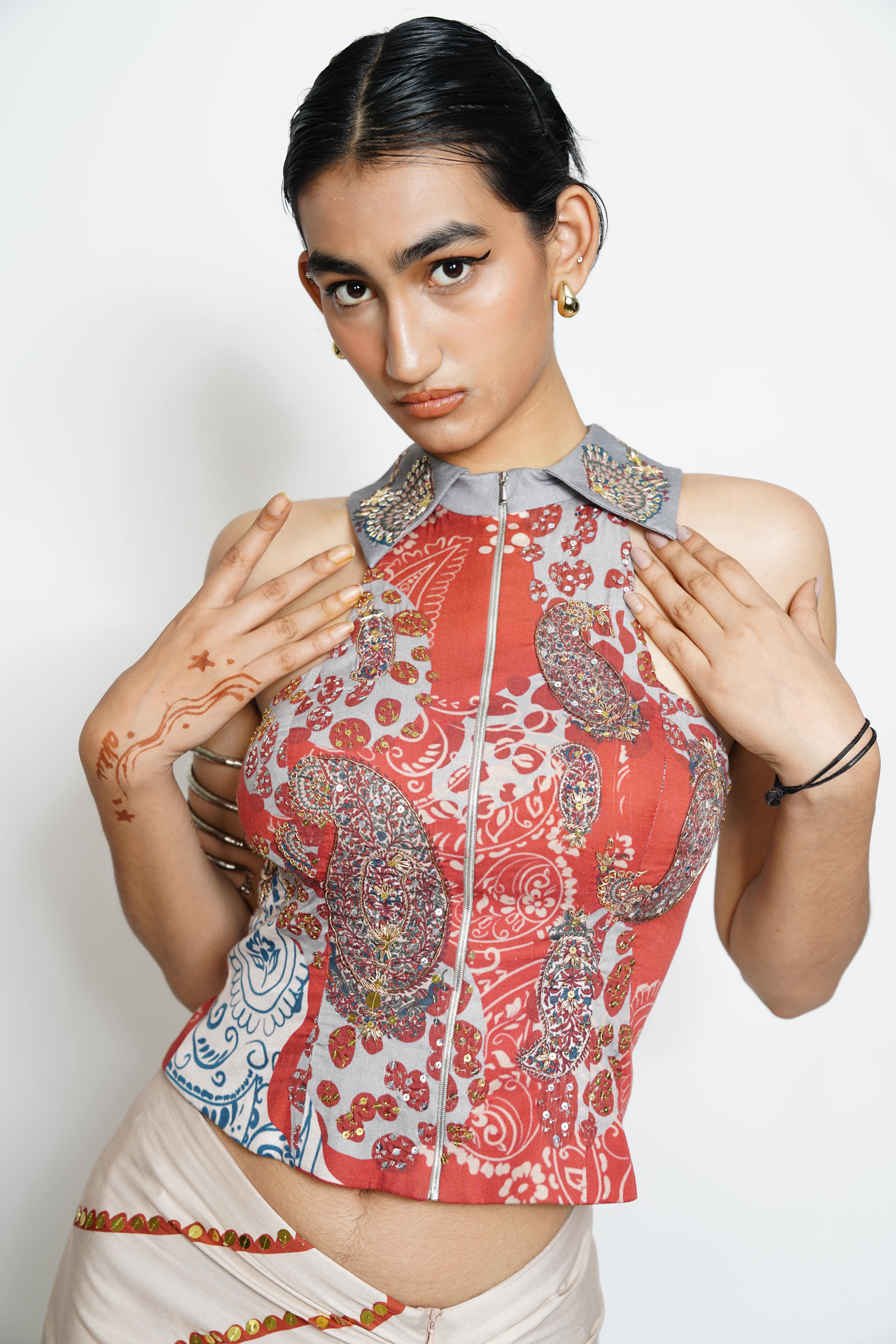 The structured silhouette, intricate patterning, and signature sleeve in Azure Glem Crop Top detail make it a true statement piece — perfect for styling with sarees, lehengas, skirts, or trousers.