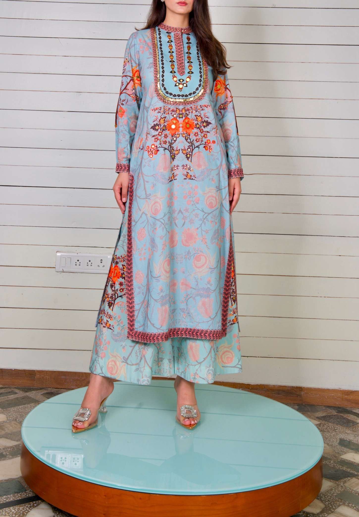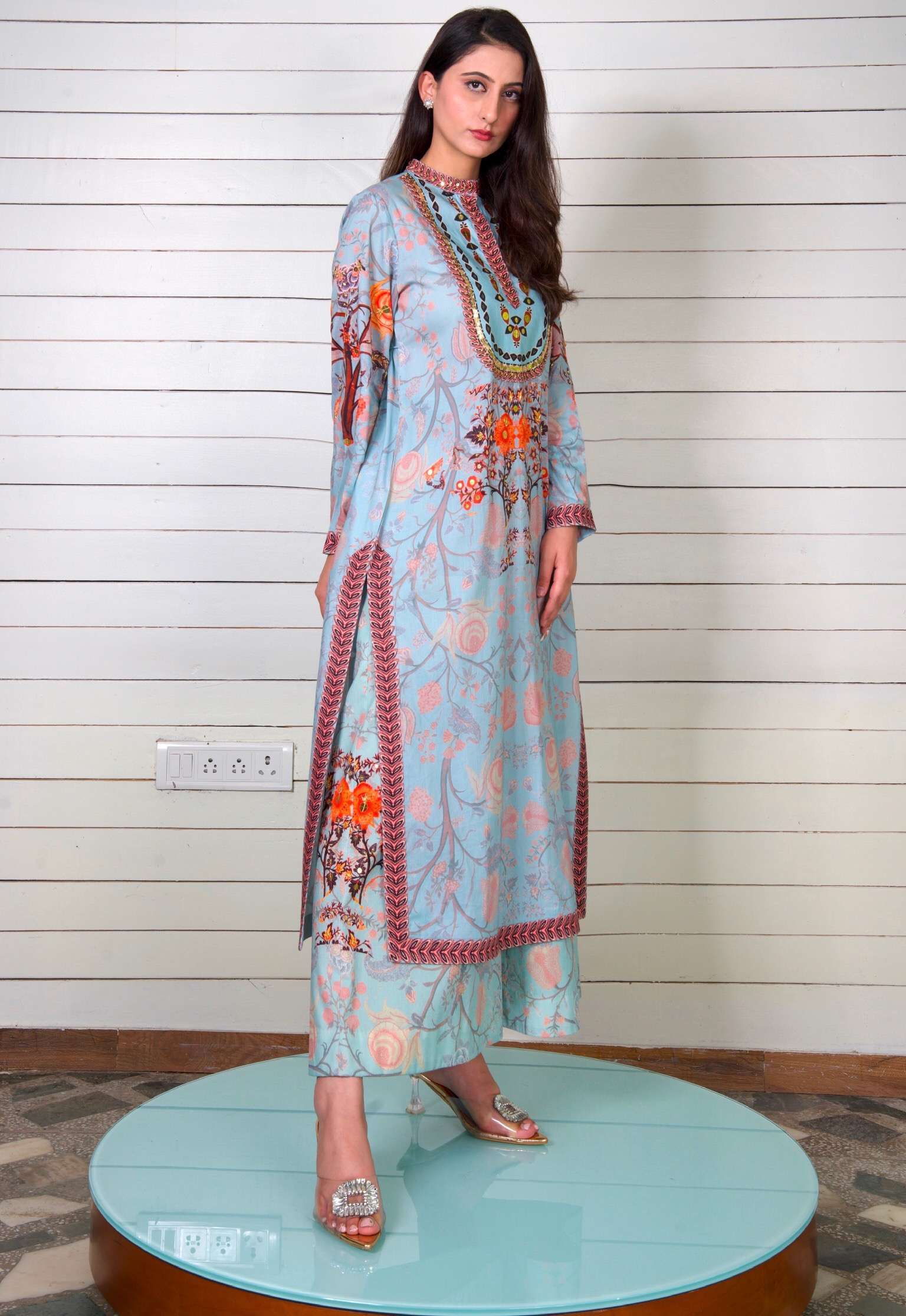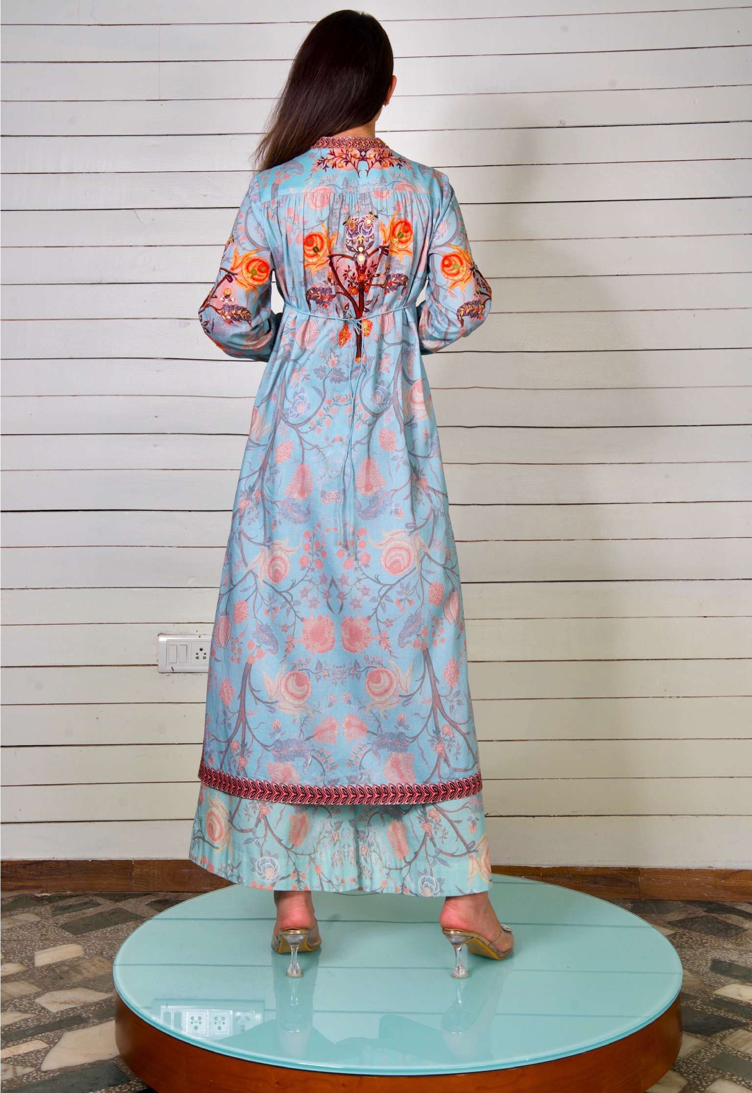 Pajarito Culotte Set: Step into comfort and style with the Pajarito Culotte Set, where airy silk Chanderi adorned with bird and bloom motifs combines with wide-leg culottes for a look that’s both relaxed and refined.