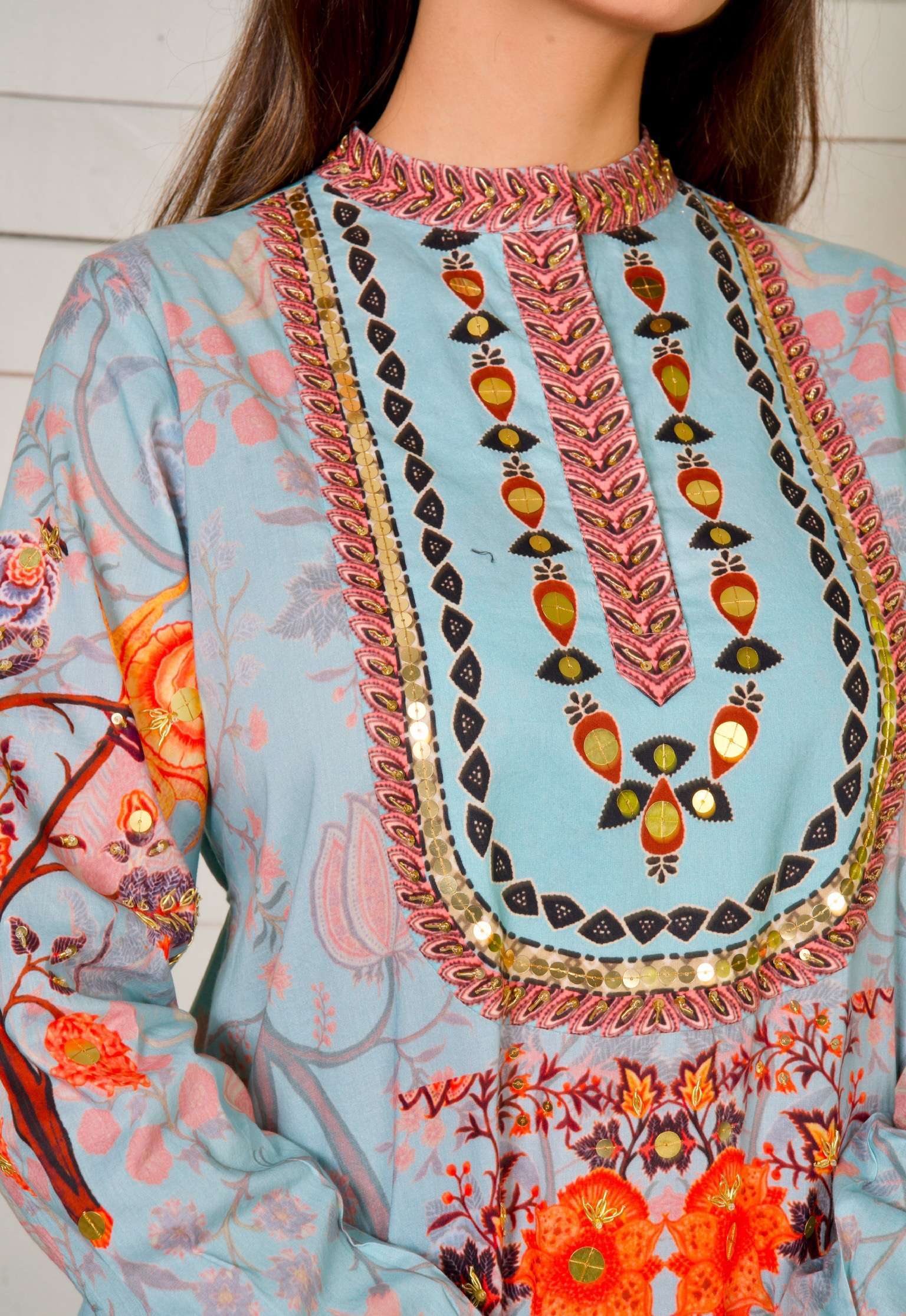Colour: Multi Colour Fabric: Georgette Print: Digital Handwork: Handwork